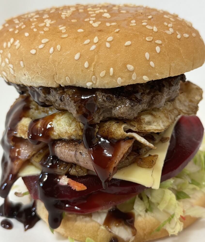 Meat Pattie, Egg, Bacon, Cheese, Fried Onion, Lettuce, Tomato, Beetroot, carrot, Pineapple, Barbeque Sauce